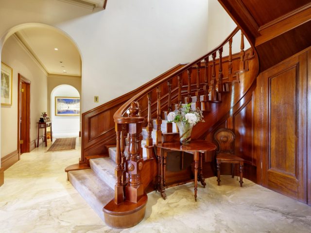 Entertaining spaces, both casual and formal, are grandly proportioned and enjoy a seamless interaction with the outdoors. Traditional lounge and dining rooms provide a stately setting for formal affairs, while an elegant music room harks back to a bygone era. Cedar-paneled walls and a domed ceiling add a regal air to the billiard room, complete with professional overhead lighting and a bar.